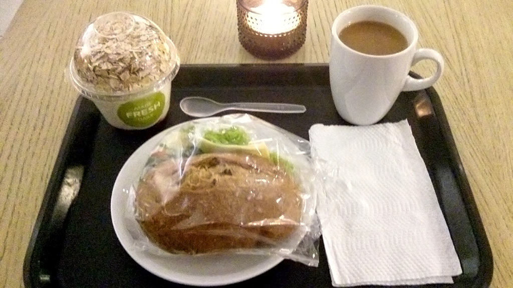 Själva frukosten är faktiskt inget vidare. Brödet är luftigt och smaklöst, Det är lite för lite sylt i yoghurten och den så kallade müslin är bara havregryn. Att det är mycket engångsmaterial gör det hela inte bättre, billigt är det ju inte heller tyvärr. Ingen höjdare.