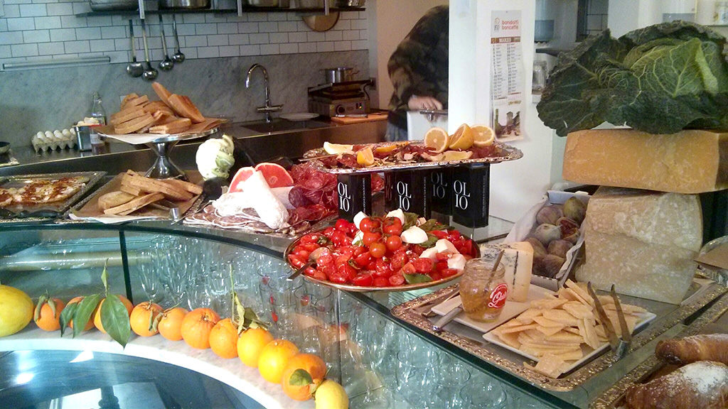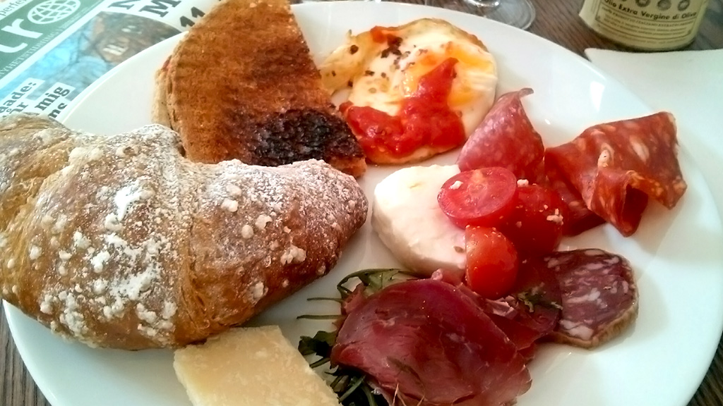 Trots att det nästan är helt fullt får jag som tur var ett litet bord längre in i den lilla lokalen. I frukostväg kan du egentligen bara välja buffén, eller det är i alla fall det enda du behöver välja. Hela disken är proppfull av italienska specialiteter med allt från caprese och croissanter via ostar och marmelad till yoghurt. Allt är fruktansvärt gott, nylagat och fräscht! Det är så jag knappt vågar ta lite till, inget som är så här gott kan väl ha fri påfyllning? Men jo, enligt den trevliga tjejen bakom disken uppmanas alla att ta mycket, och fler gångar. Trots det höga trycket på frukostgäster flyter allt smidigt och maten fylls på och kaffe bryggs.