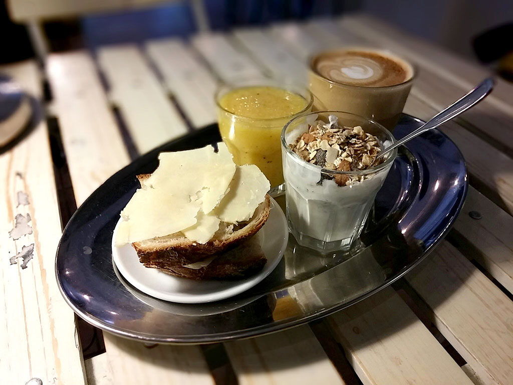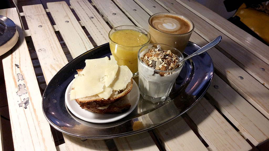 Frukostutbudet består av två menyer, en lite större och en något lite mindre. Det tar lite tid att få frukosten, men det är det värt. Juicen är fräsch, hemmagjord råsaftsuice och lite "grov", riktigt god! Mackan är en surdegsmacka med god ost och yoghurten serveras med müsli och honong i ett glas. Plus i kanten för att inget är serverat i plast!