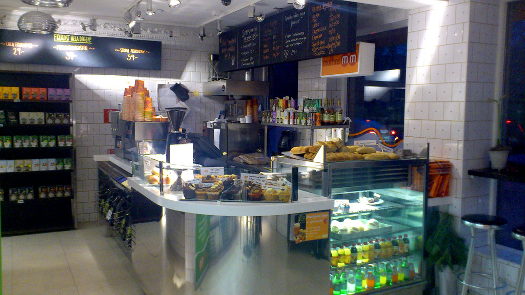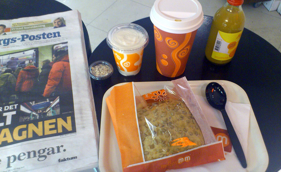 När jag är här är det inte speciellt stor ruljans i businessen, utan jag kan välja precis var jag vill sitta, eftersom sitta vill jag, trots att det inte riktigt känns att det är det primära målet för Muffins MM. Det finns tre frukostalternativ – liten, mellan och stor, och givetvis tar jag den stora, allt för att testa av så mycket av stortimentet på en gång! Det som slår mig är hur fasligt mycket engångs det är, vilket det ju i och för sig är på många ställen, och det gör mig lite irriterad. Kan man inte diska för de som sitter inne och äter och dricker? Annars är det hur som haver gott och framförallt känns det prisvärt, priset landar 5-10kr lägre än hos konkurrenterna i området. En annan en bra detalj är att det finns GP, adjöss Metro! :)