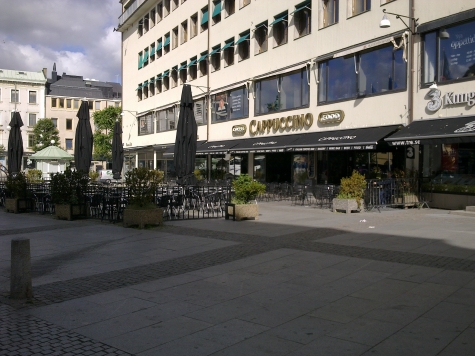 Även Cappuccino har legat i stan så länge jag faktiskt kan minnas, men jag tror nog inte jag varit här på säkerligen 15 år. Det ligger troligtvis på stans bästa läge på Kungsportsplatsen med en riktigt stor solsäker uteservering. Inredningen var faktiskt fräschare än jag föreställde mig. Det är fräscht, stort, luftigt och rätt trevligt inrett, men inte speciellt caféaktigt. Det verkar inte som att man får så mycket frukostbesökare utan det tar ett litet tag innan en i köket ser mig från luckan och kommer ut.