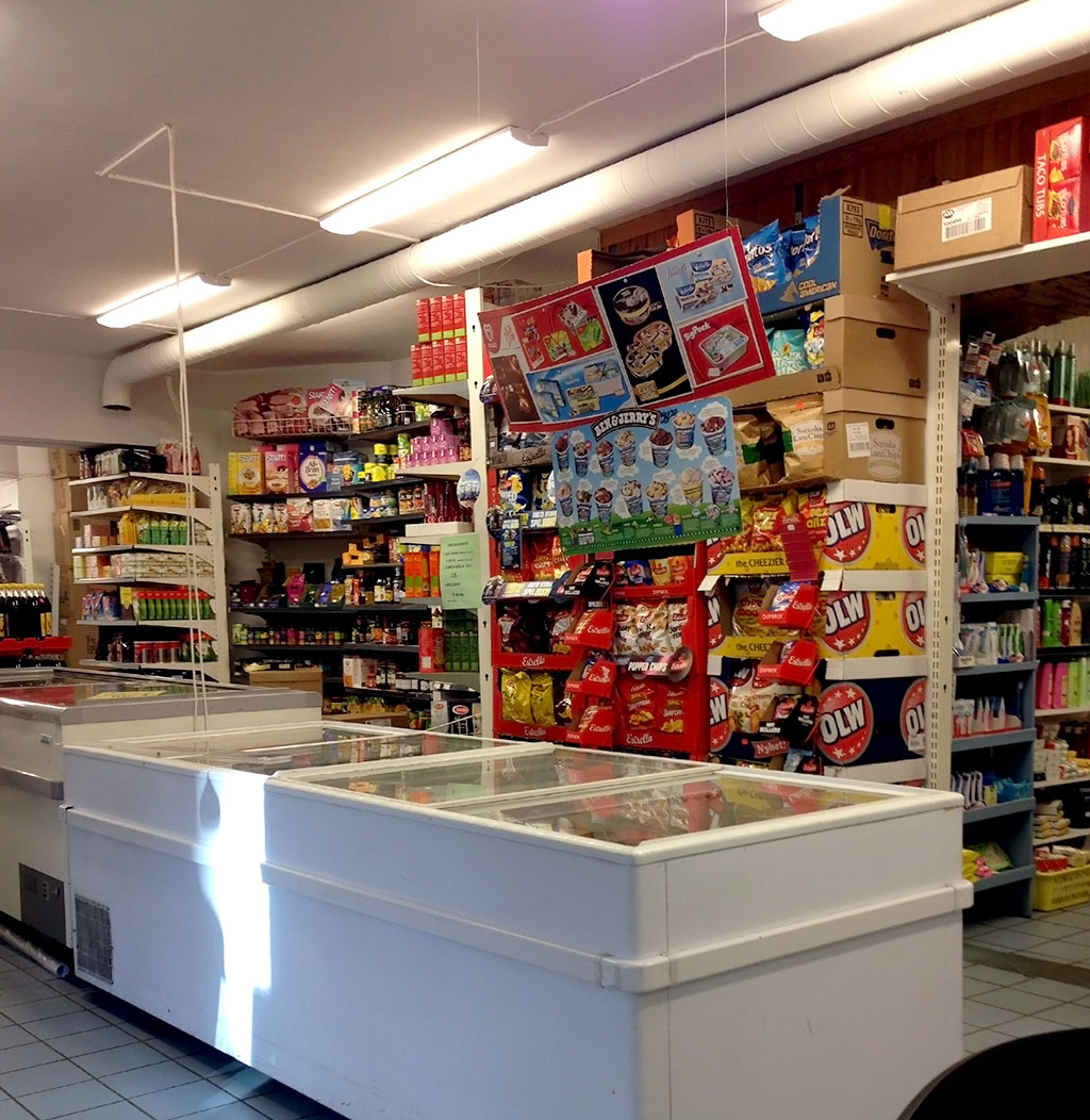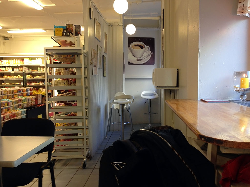 Utbudet på frukost är ju egentligen vad som finns på hyllorna i butiken, men det finns även en kyl med smörgåsar, juicer och ta-med-mat. Några mer seriösa frukostmenyer är det inte utan kaffe från maskin, juice och mackor är det som finns. Påtår till kaffet fås för en femma. Min ost-och-skinkfralla var rätt god, men kunde gärna varit lite mer välfylld, en gurka och en bit tomat är lite i snålaste laget tycker jag.